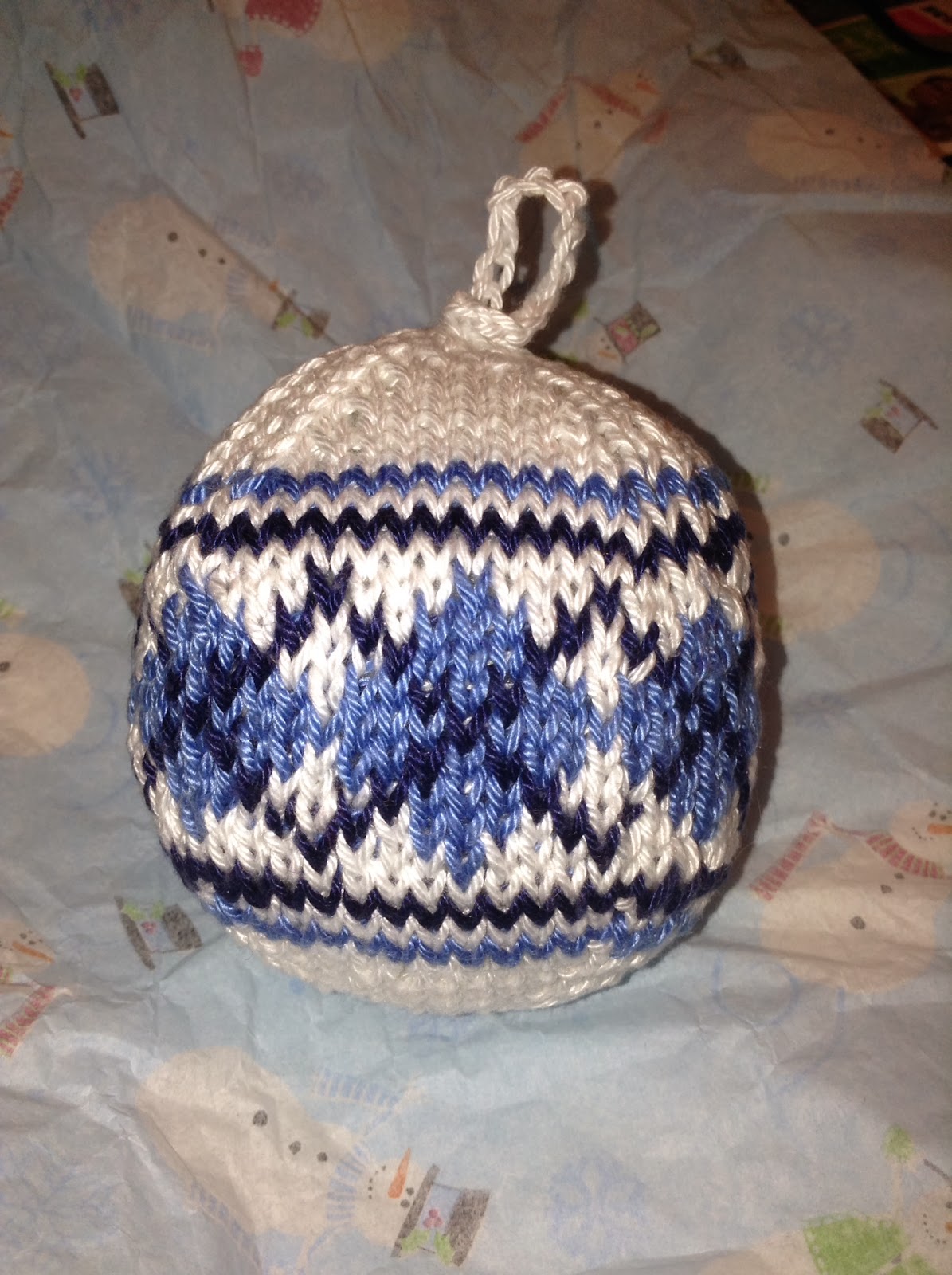The book arrived and I thumbed through it and looked online for ideas, too. I decided I'd make a couple knitted Christmas balls each month, so I'd have a bunch by next Christmas. I made 3, and then got obsessed with working jigsaw puzzles. Larry fixed me a tabletop that fit over our patio table, which we had moved into the sunroom for Christmas dinner. The table and puzzles were in there until it warmed up in late spring. I have to admit, I've missed it, but have accomplished a lot more with it gone! Fast forward to August. I had not knitted any more balls, so I made myself sit down and start again. Now I'm obsessed with knitting them. I can whip one out in about 4 1/2 hours. I've started graphing out my own designs. What fun! Here are pictures of a few of them.